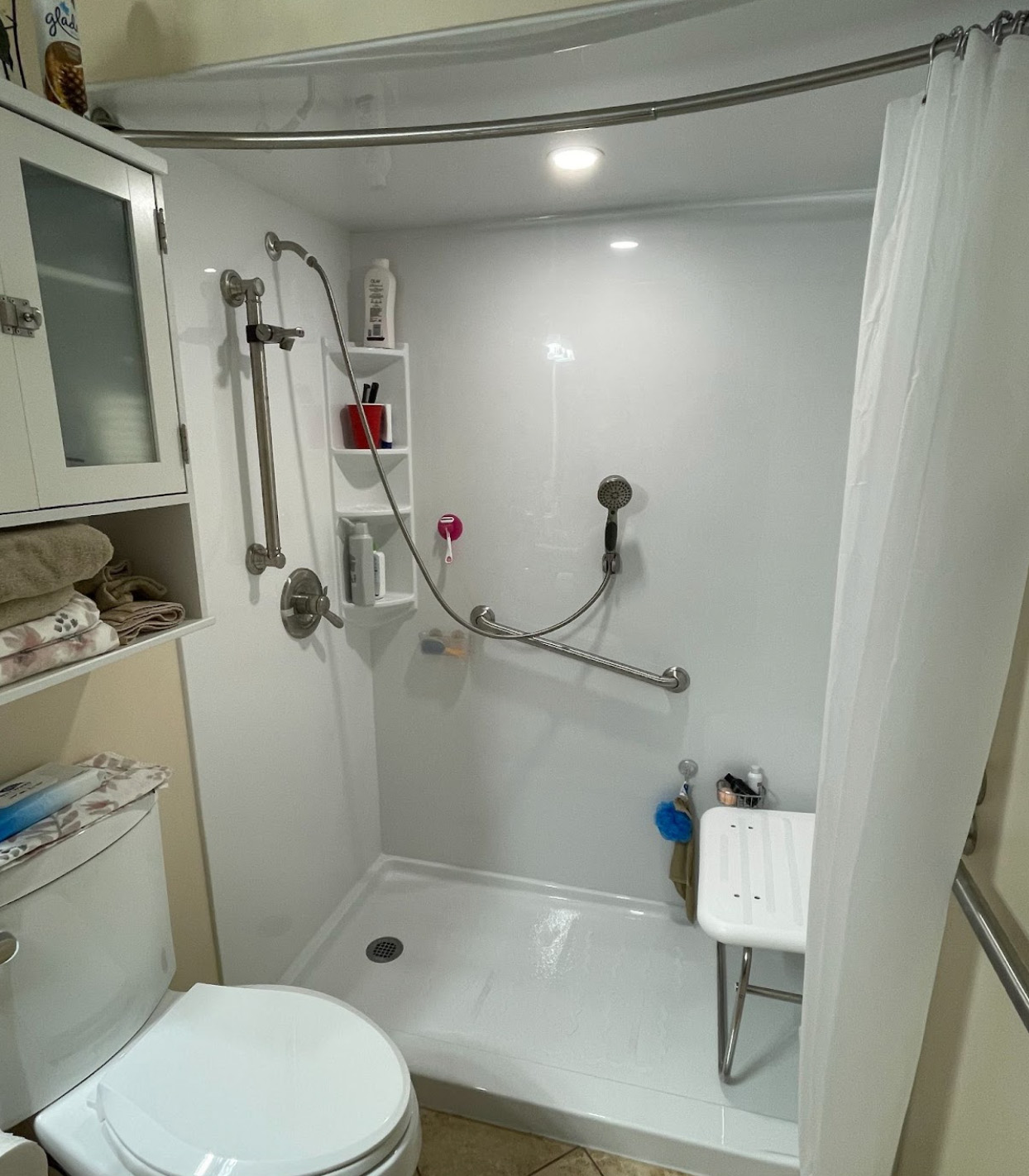 One of our most transformative services is the bathroom tub-to-shower conversion, which addresses one of the biggest safety concerns for aging adults. Traditional bathtubs require a dangerous high step-over that becomes increasingly difficult and risky as mobility declines. Our tub-to-shower conversions replace that hazardous bathtub with a modern, accessible shower featuring a low or no-threshold entry that virtually eliminates the risk of tripping. These conversions include slip-resistant flooring, built-in seating options for those who can’t stand for extended periods, and strategically placed grab bars. Grab bars are always placed at the customers preferred location, ensuring a perfect placement for their stability.